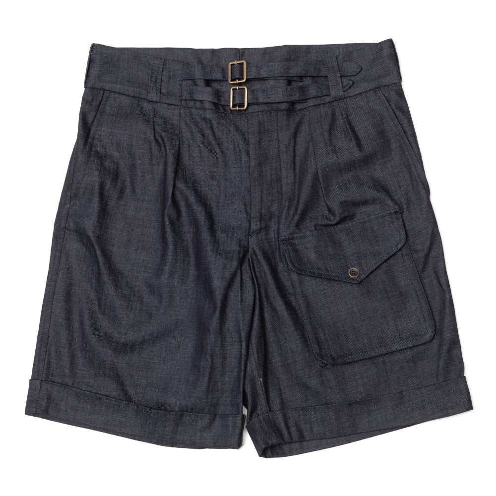 Inspiré de shorts militaire anglais avec son iconique ceinture a sangle qui permet de bien ajusté la taille et de porter le pantalon sans ceinture . La présence de passant permet si besoin l'utilisation d'une ceinture